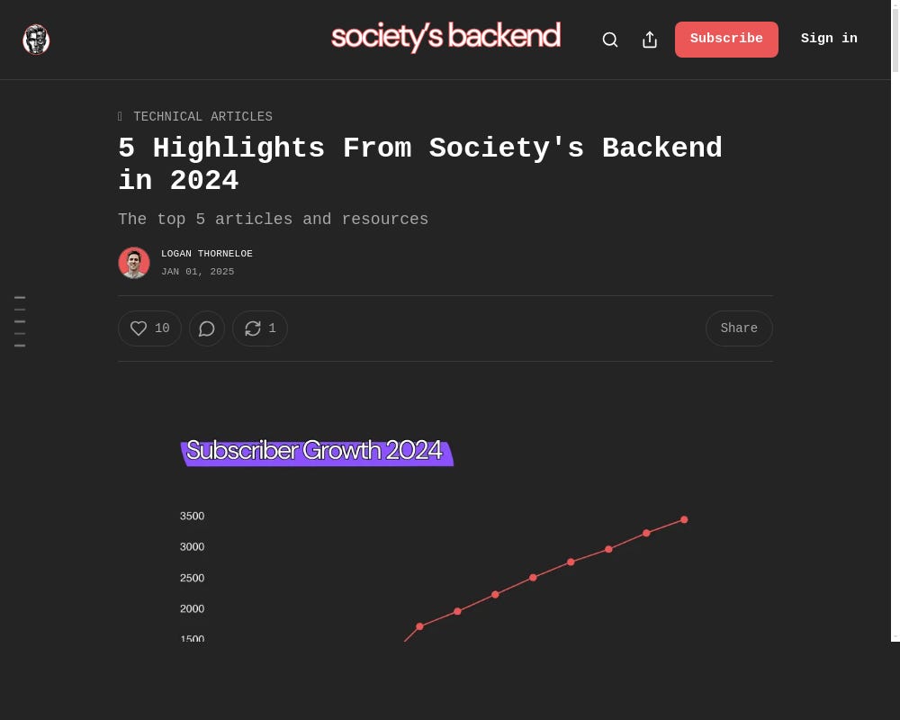 Society's Backend grew from 345 to 3,445 members in 2024, thanks to the support of paid subscribers. Key highlights included creating a free machine learning roadmap, discussing the role of AI in software engineering, and collaborating with AI professionals to share insights. The author plans to enhance content quality and explore new formats in 2025 while continuing to support understanding of AI.
