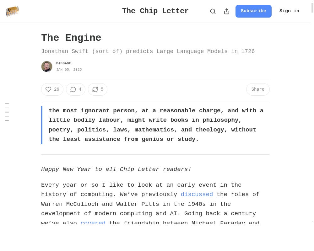 Gulliver encounters a machine called the "Engine" in Jonathan Swift's *Gulliver's Travels*, which generates sentences using pieces of wood covered with words. This machine serves as a satirical commentary on the potential of mechanized writing, likening it to modern language models that generate text through probabilistic techniques. Swift critiques the idea of reducing creativity to mere mechanics while hinting at the absurdity of technology replacing human effort in writing.