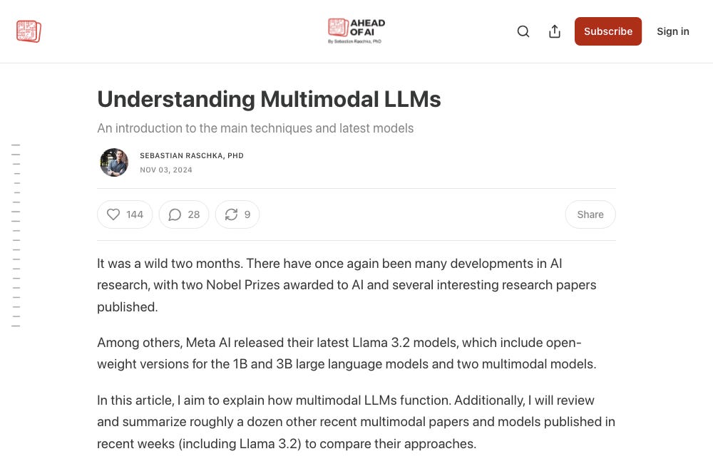 The article explains multimodal large language models (LLMs), which can process different types of data like text, images, and audio. It highlights two main approaches for building these models: the Unified Embedding Decoder Architecture and the Cross-Modality Attention Architecture. The author also reviews recent multimodal models, including Meta AI's Llama 3.2, showcasing their capabilities in tasks like image captioning.