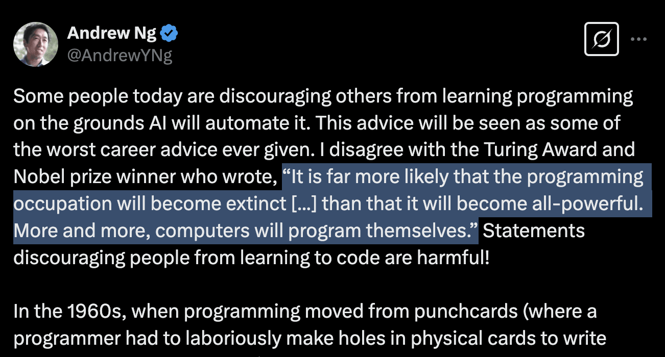 Andrew Ng beautifully stated an argument I (and many others in the ML engineering space) have been making for a while. Teaching people NOT to learn how to code because AI will automate it is not only incorrect and silly, but has potential for long-term negative ramifications in the field of computer science.