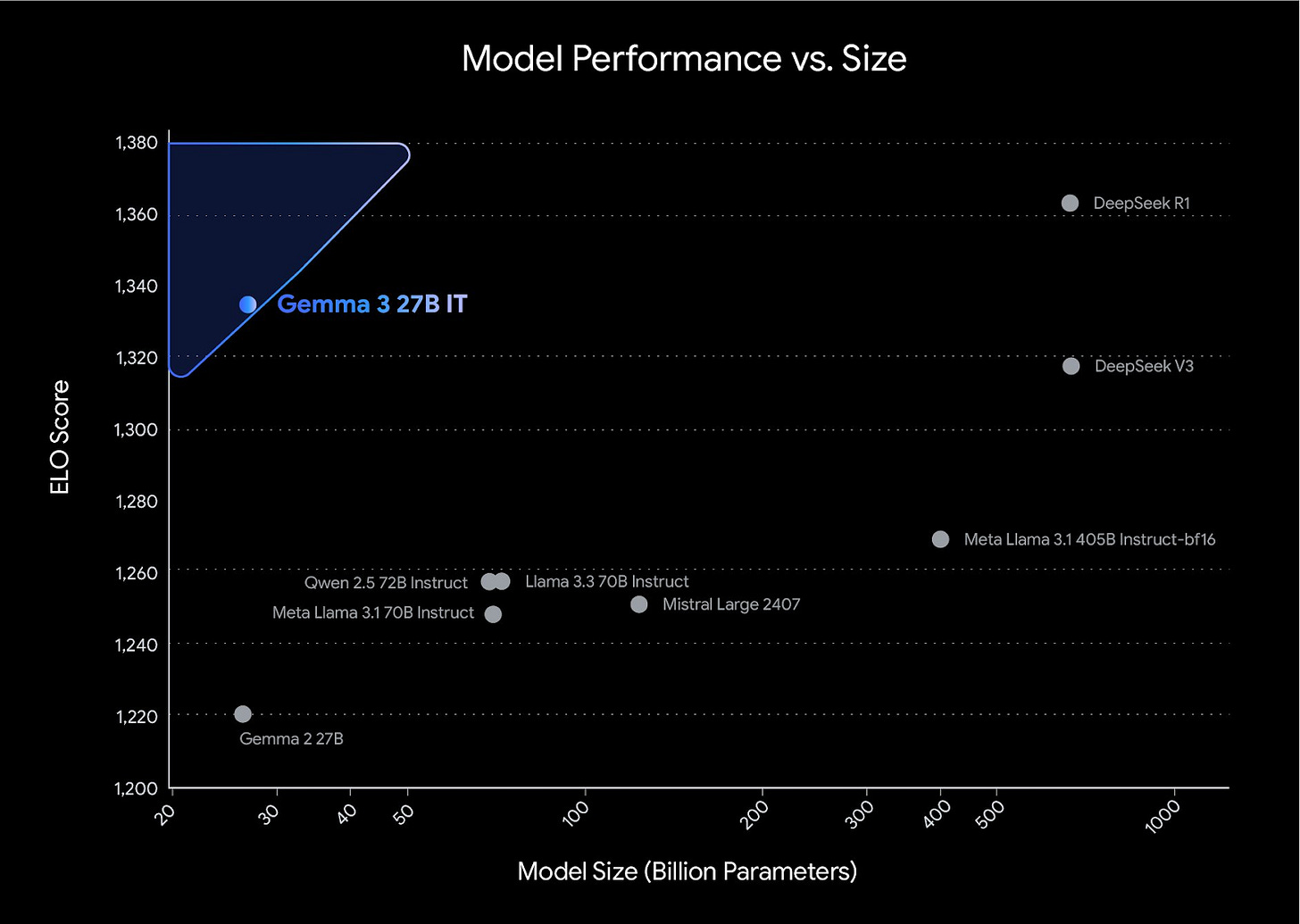 Google released Gemma 3 this past week. Itâs an open model that touts high performance (see image above) and can be run on a single TPU. Itâs small (only 27 billion parameters), performant, efficient, open, and natively multimodal. It seems like an excellent choice for building, just be aware of what is restricted by its license. Itâs great to have Google iterating on an open model and seeing the gains they are.