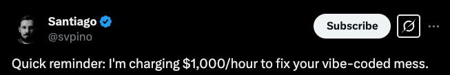 Iām starting to think Santiagoās vision might actually be the future of software engineering. Maybe software engineers will become freelancers coming into fix what AI was incapable of and maybe weāll get paid a lot more to do it.