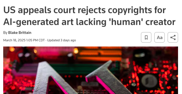 This past week a US appeals court reaffirmed that AI-generated content cannot be copyrighted. This reaffirms the requirement for human authorship for content to receive copyright protection.