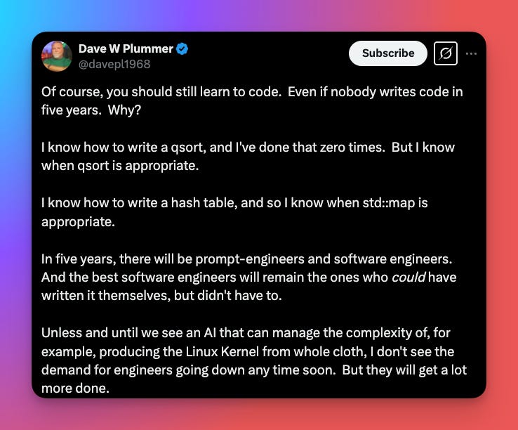 I wonât harp on this too much because it was part of ML for SWEs two weeks ago, but this is a friendly reminder that itâs still a fantastic time to learn how to code. I donât quite understand how after the vibe coding messes from last week we can still come to the conclusion that it isnât worth learning to code anymore.