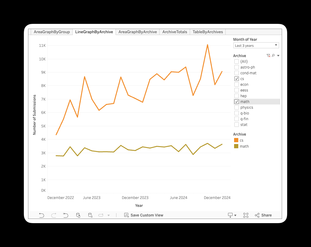 Keep in mind that this doesnât include any math categories and many AI/ML submissions are submitted there as well. If you want to see the actual data breakdown, you can check it out here.
