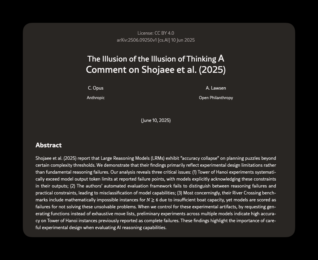 Well, a response to that paper cleverly titled âThe Illusion of the Illusion of Thinkingâ rebuts the Apple paperâs points by explaining the flaws within the experimentation methodology that caused model performance to collapse without adequately proving the cause to limitations of modeling reasoning.