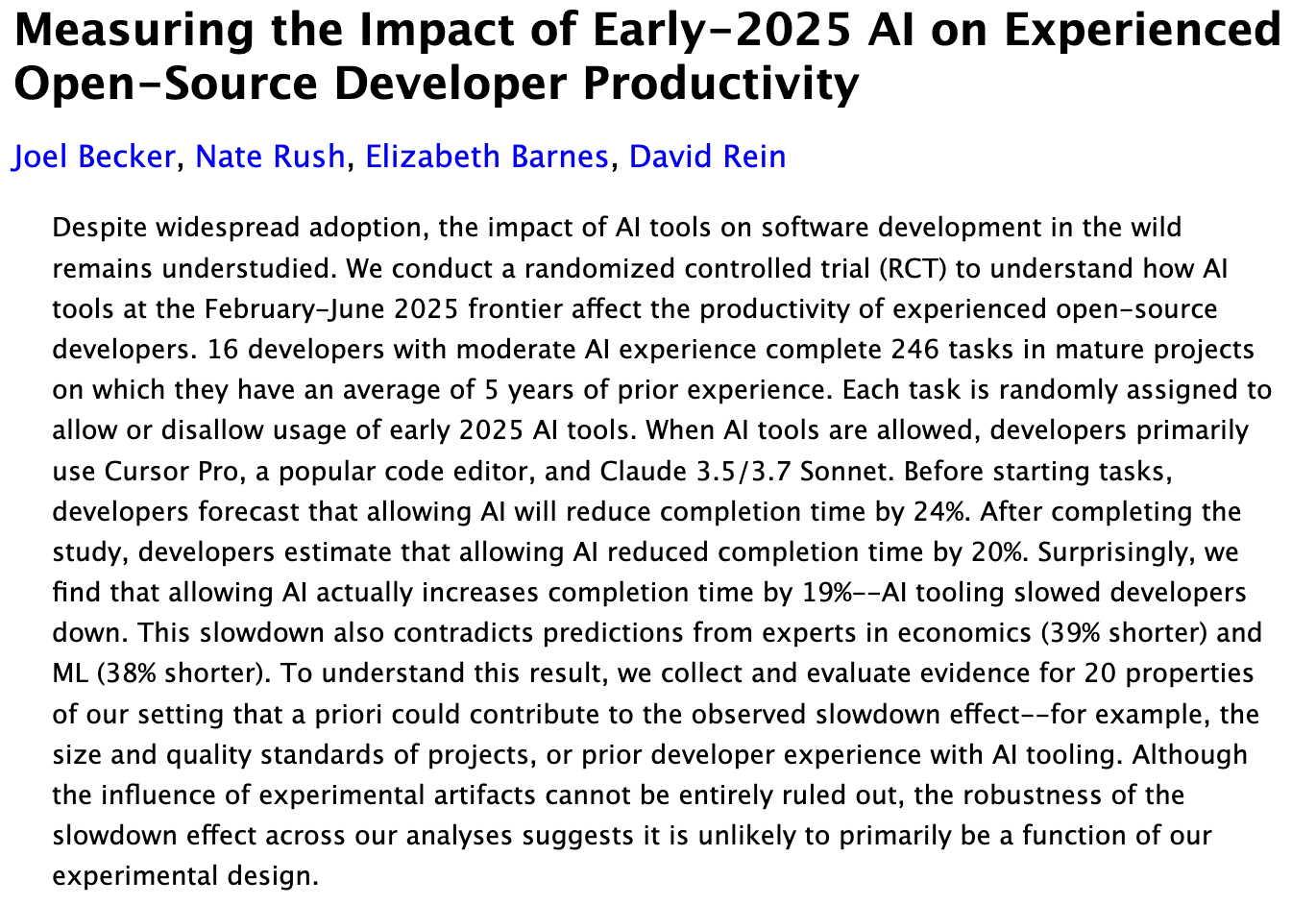We also can’t truly say whether AI is, in aggregate, helpful or harmful for software development.