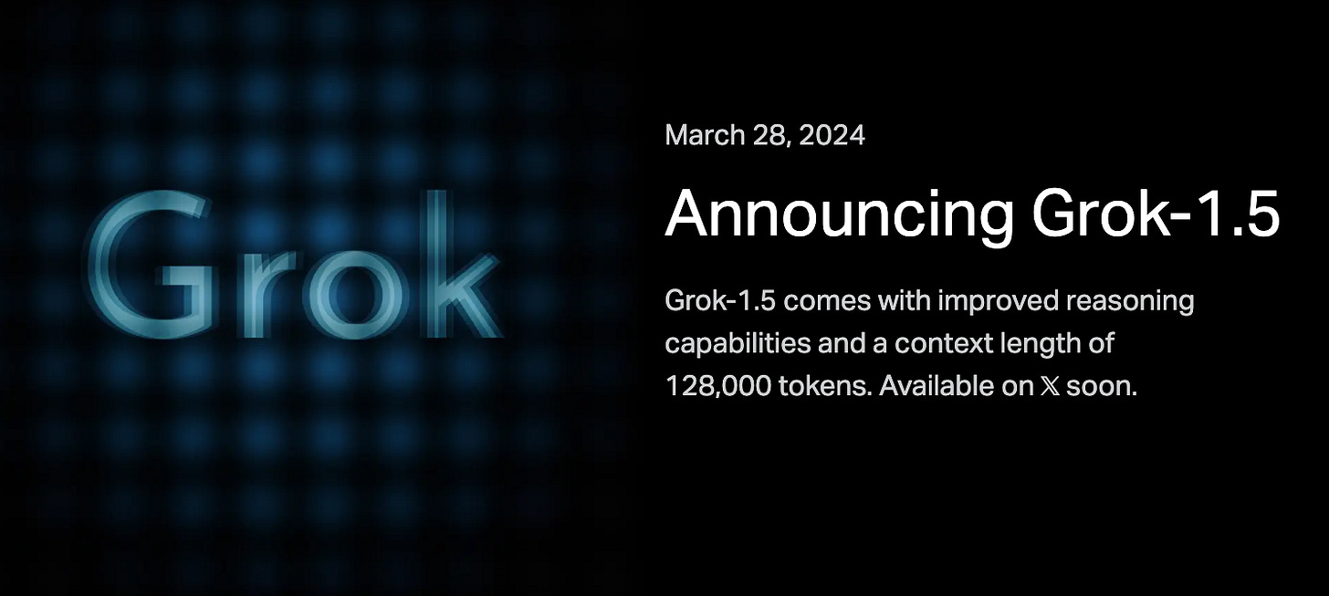 xAI recently released the weights of Grok-1 and are now set to released an improved version of Grok to X. Benchmarks show Grok-1.5 to be comparable to GPT-4 and similar models. Grok-1.5 also has a context window of 128,000 tokens making it 16 times longer than Grok-1. This isnât as large as other large context window models, but xAI and X are in a great position to develop an excellent LLM. They have both a platform to distribute the LLM, but more importantly training data to continually improve it that doesnât risk lawsuits.