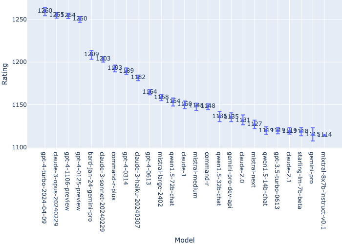 Understanding confidence intervals. If you look at the leaderboard, you’ll see there are three different models (as of 4/15/2024) in the #1 spot. GPT-4-Turbo, Claude 3 Opus, and GPT-4-1106-preview have all been awarded the top spot. This is because confidence intervals (CIs) are calculated for each model to understand a possible degree of error in the benchmarking process. This means a model with an Elo of 1260 and a CI of +5/-5 may or may not be better than a model with an Elo ranking of 1255. The closeness in performance of those models makes it difficult to distinguish which is considered better. When GPT-4-Turbo came out, every influencer took the chance to announce the news of a new winner on the Chatbot Arena leaderboard. In reality, it took the top spot but just barely.
