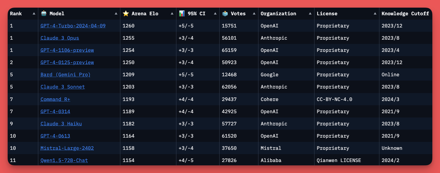 The leaderboard then shows the order of best to worst LLM based on each model’s Elo score. The leaderboard table has the following columns: