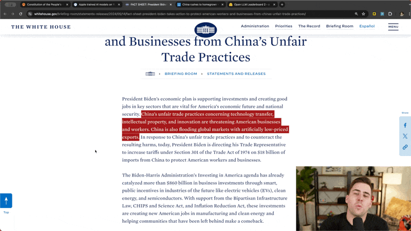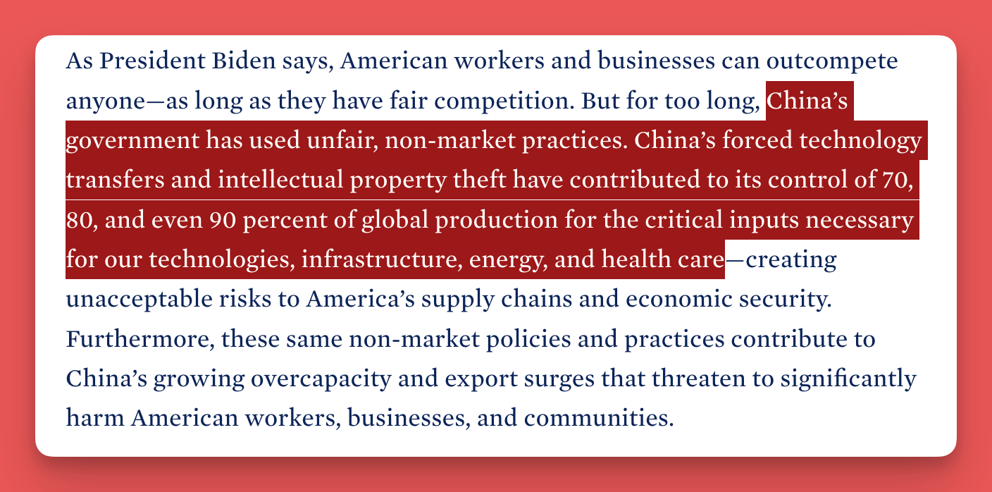 Import restrictions and tariffs: President Biden has banned the export of “advanced chips” to China including the GPUs necessary for machine learning. This was mentioned in Nvidia’s 8-K filing in October 2023. This means Chinese companies aren’t able to get their hands on the same level of state-of-the-art compute as US companies.