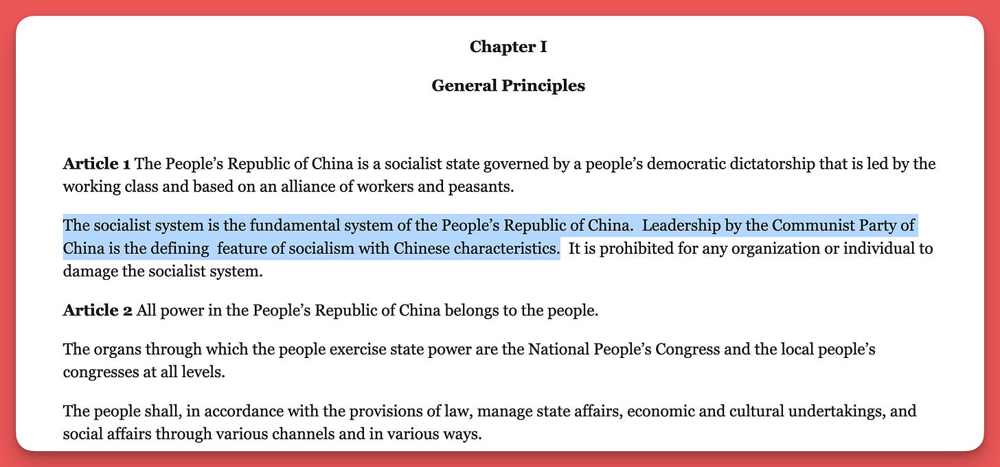 The Chinese Constitution reads that China is a socialist country run by the Chinese Communist Party (CCP). Most western countries are primarily capitalist, which means the individual human rights between and powers of government between the two are very different. The Chinese government is set up to centralize power and enable the government to enact regulation based on what they believe is best for China as a whole. This has received criticism from western countries because it often allows the government to enact policy at the expense of the individual.