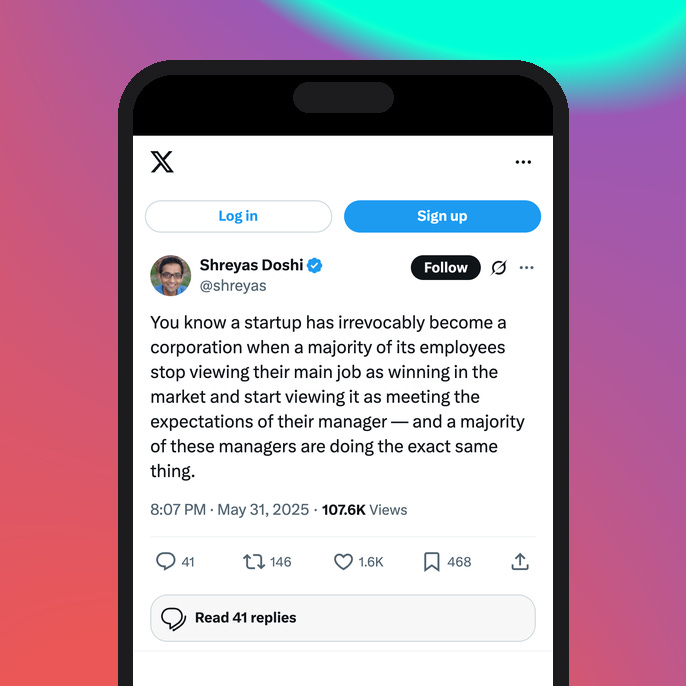 The tweet below exemplifies this perfectly: Companies start losing when they shift away from innovating and toward maximizing internal processes.