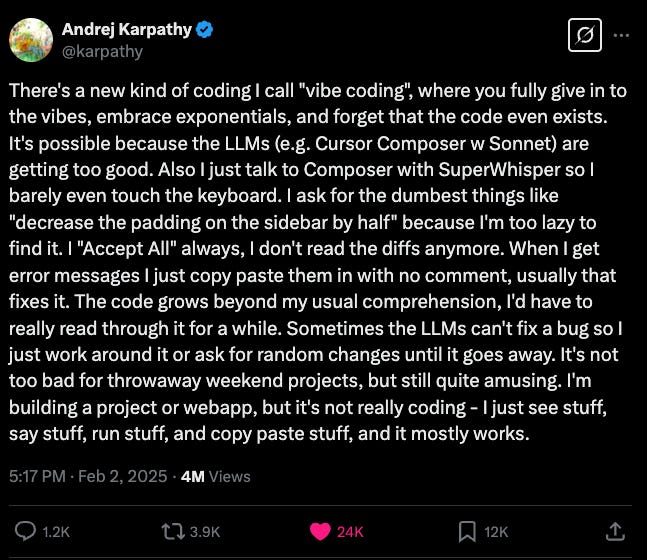 Vibe coding is a term coined by Andrej Karpathy on X that is essentially giving AI a list of system requirements and letting it take over from there. Engineers take a more hands-off approach to let the AI “do its thing”.
